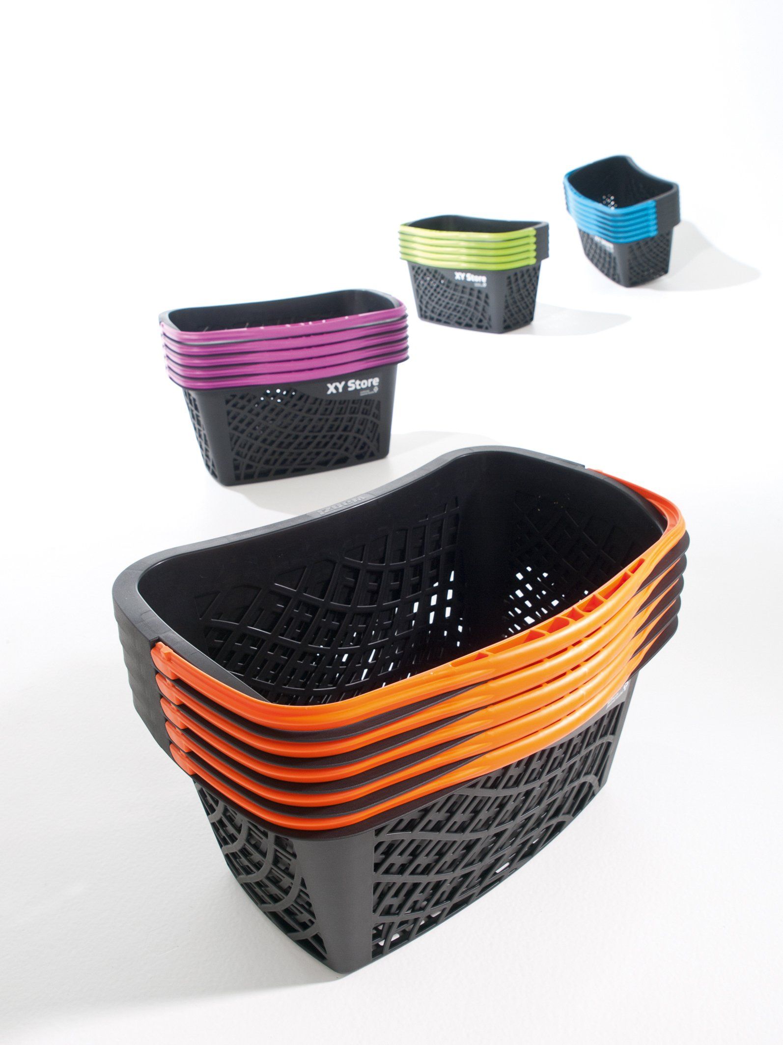 cesto sempre nero, manico azzurro, verde, magenta, arancione