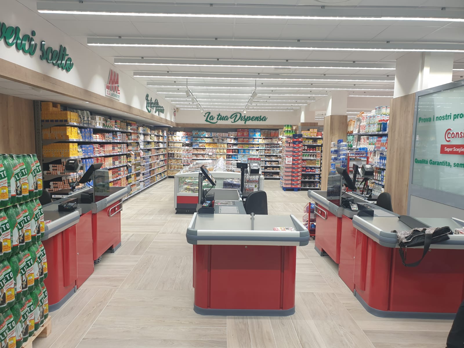 Restyling del pv della catena Elite, fornitura di scaffalature, banchi cassa, attrezzature reparti, carrelli spesa,